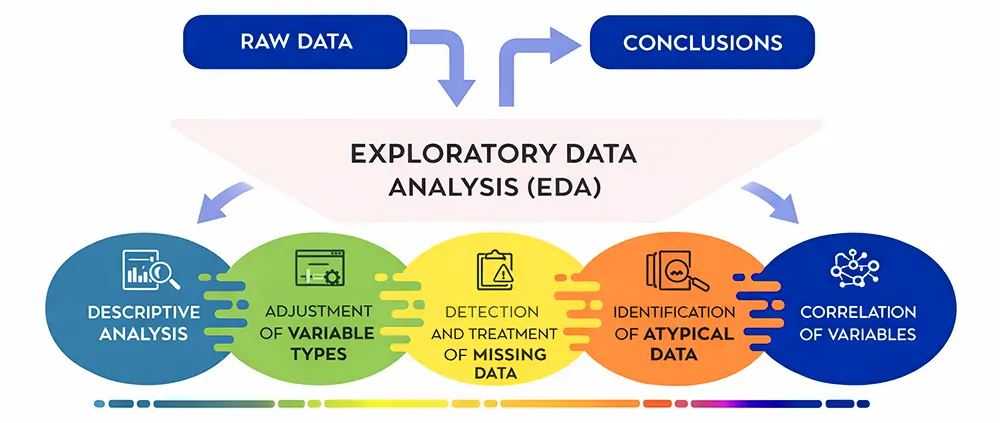 Data scientists use EDA to study how data distributes across different values while they search for missing data and incorrect information and outlier detection and feature correlation analysis. In Python developers use Pandas and NumPy and Matplotlib and Seaborn as their main tools to perform this task.