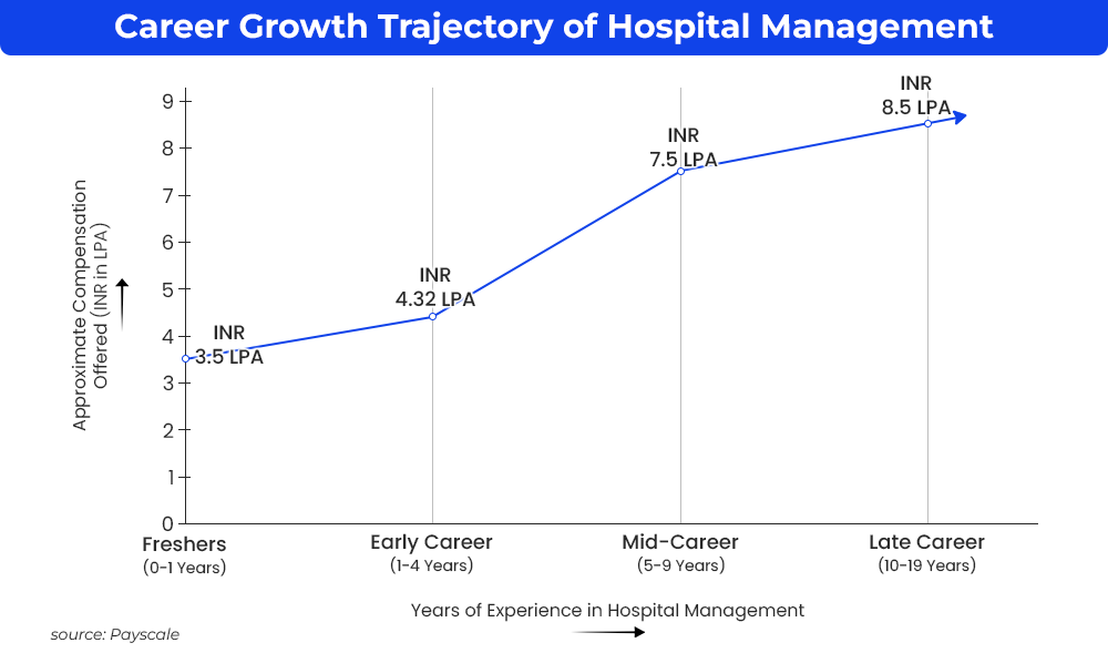 The growth trajectory for a hospital manager is quite lucrative, and while they may earn moderate and decent salaries at the trainee and executive levels, the earning potential for hospital management is quite high. With seniority and experience, one can experience significant financial growth in this domain, as has been illustrated below. (Please note the figures in the graph are projected based on current compensation standards in India and are liable to change)