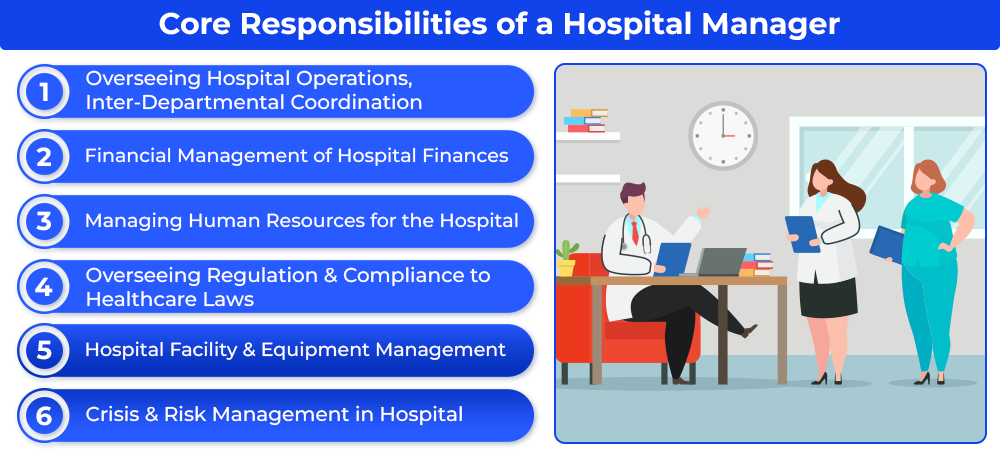 Listed below are a few of the key domains of responsibility for a hospital manager. (Please note, this list is neither conclusive nor exhaustive, as this role is quite flexible and may require a number of miscellaneous responsibility-handling as per the situational demands).