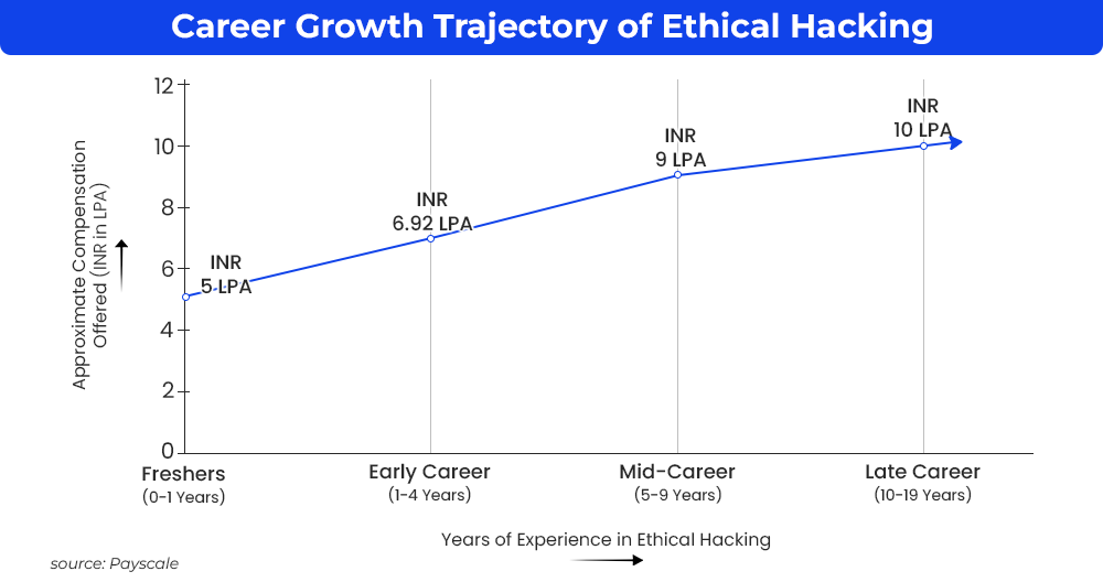 Ethical hacking offers a steep and attractive scope of financial growth in the current employment landscape. Additionally, since the field is currently transitioning into a mainstream IT career, the compensation figures are also expected to boom for this role. Represented below is the average career trajectory with respect to compensation that one can expect as an ethical hacker. Please note that the graphical representation is based on the current compensation figures as per Indian standards and is liable to change with time.