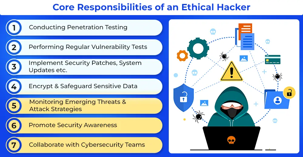 A typical profile for an ethical hacker includes responsibilities such as regular penetration testing, vulnerability testing, implementation of security patches, system updates, safeguarding of sensitive data, and so on. The role revolves around upholding the cybersafety of information systems, data systems, and so on. A representation of the core responsibilities of an ethical hacker is presented below.