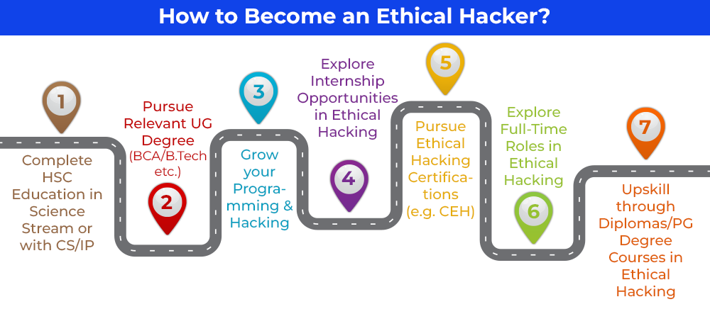 To become an ethical hacker in India, you must first complete high school education in the science stream (or with subjects like Computer Science/Informatics Practices), followed by a relevant UG degree (BCA/B.Tech in cybersecurity/ethical hacking). After completing your UG education, you can start exploring internship or full-time opportunities in ethical hacking while upskilling through formal certifications such as Certifiied Ethical Hacker (CEH), CompTIA Security+ certificate, Certified Information Systems Security Professional (CISSP) etc.