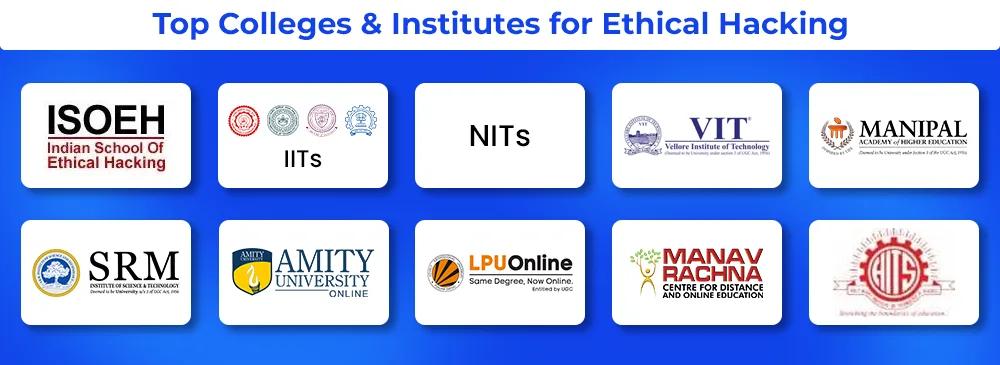 The top technical institutions in India, including those like the Indian School of Ethical Hacking, IITs, NITs, etc., offer courses in cybersecurity and ethical hacking, which can provide a robust start to your ethical hacking career. A few such eminent institutions are illustrated below.