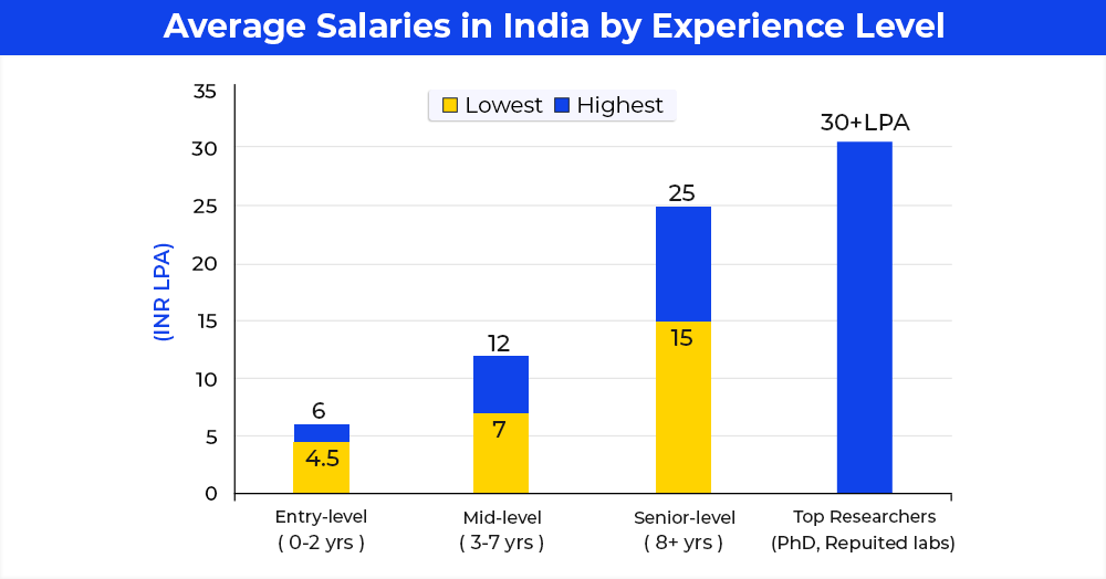 AmbitionBox also provides a precise salary range, and again, there is a bigger variation here. As per AmbitionBox statistics, initial salaries for Research Scientists in India can be as low as Rs. 3 lakh annually for fresh recruits or those who work in smaller organisations. Experienced scientists, or those who work with large research firms, top lab organisations, or multinational corporations, can get as much as Rs. 19.8 lakh annually. In very exceptional cases, the salary can reach up to Rs. 25 lakh a year.