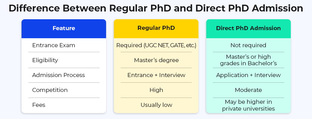 As a rule, students need to clear entrance exams such as UGC NET, CSIR NET, GATE, or university-level exams to obtain admission to a PhD. However, direct PhD admission is provided in some universities. In this, students obtain admission into a PhD course without an entrance exam. The admissions are most often based on past academic history, research proposals, work experience, or an interview.