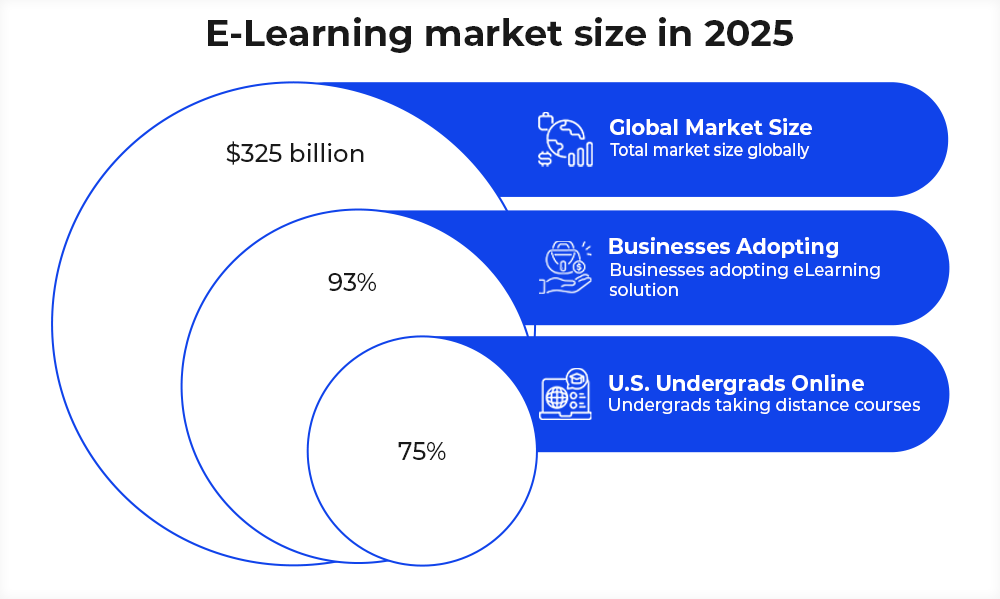- Industry statistics show that in 2025, e-learning will have achieved USD 325 billion worldwide, a 14 per cent increase over 2024.