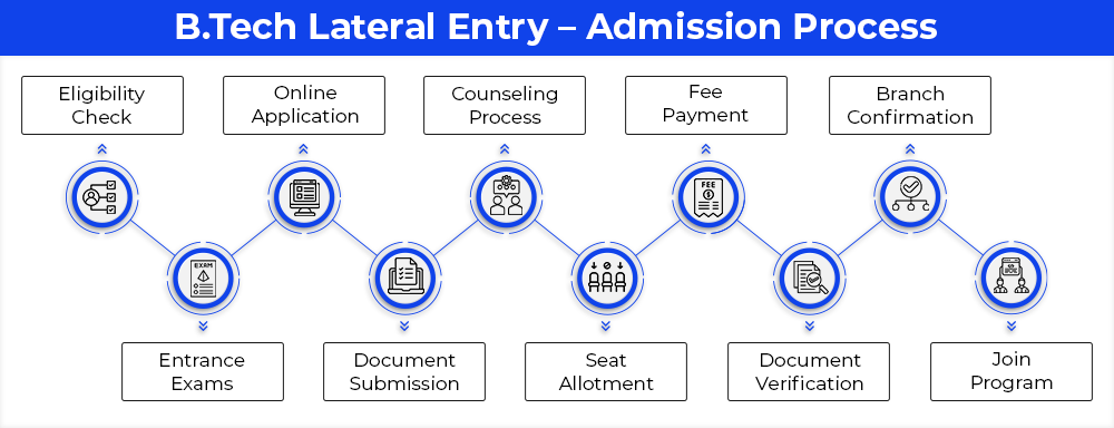 B.Tech Lateral entry is a way of admission through which a student who holds a diploma in engineering can join the second year of a B.Tech degree course without the first year. This choice is best suited to individuals who have a three-year diploma in any of the following subjects, Mechanical, Civil, Electrical, Electronics, Computer science or any other related course. Normally, a candidate should have a minimum cumulative mark of 45-60% in their diploma, but this can differ among institutions. There is no age restriction in lateral entry, and that is why it is available to a large group of learners, including working professionals.