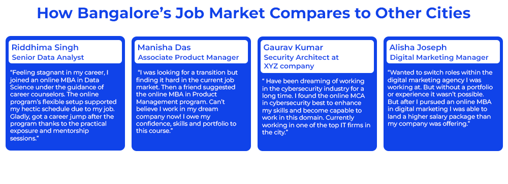 So, one thing is clear, the career trends in Bangalore 2026 point toward AI‑driven roles, data science, cybersecurity, product management, and digital‑marketing roles as the most promising paths for job‑seekers. Clearly, the city offers many opportunities that individuals can explore…from high salaries, culture of continuous learning, working in desired projects etc. The possibilities are vast and now with options of online learning, many are best positioned to tap into these opportunities.