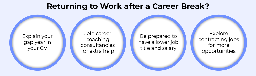 Work-life balance can also be difficult. Returning professionals might have new responsibilities at home, and it does take some time to readjust to work. To make it easier to adjust, it is a good option to begin by doing flexible or part-time work if possible.