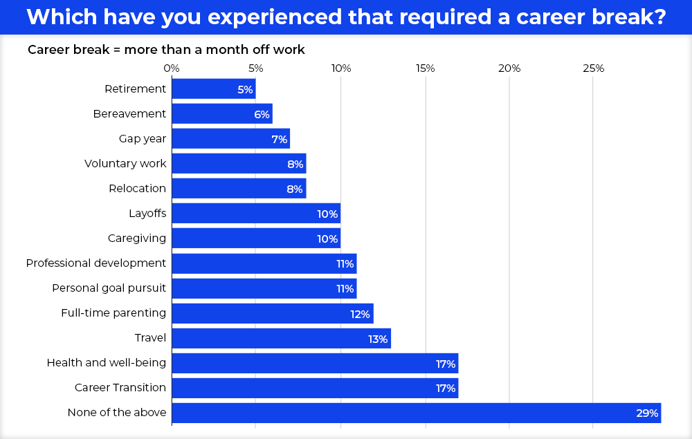 In the United States, a survey by HR found that 47% of employees have had a career break sometime in the past, and statistics from more than 27 million resumes indicate that career gaps lasting more than 12 months now occur in 25% of profiles, compared to 19% five years ago.
