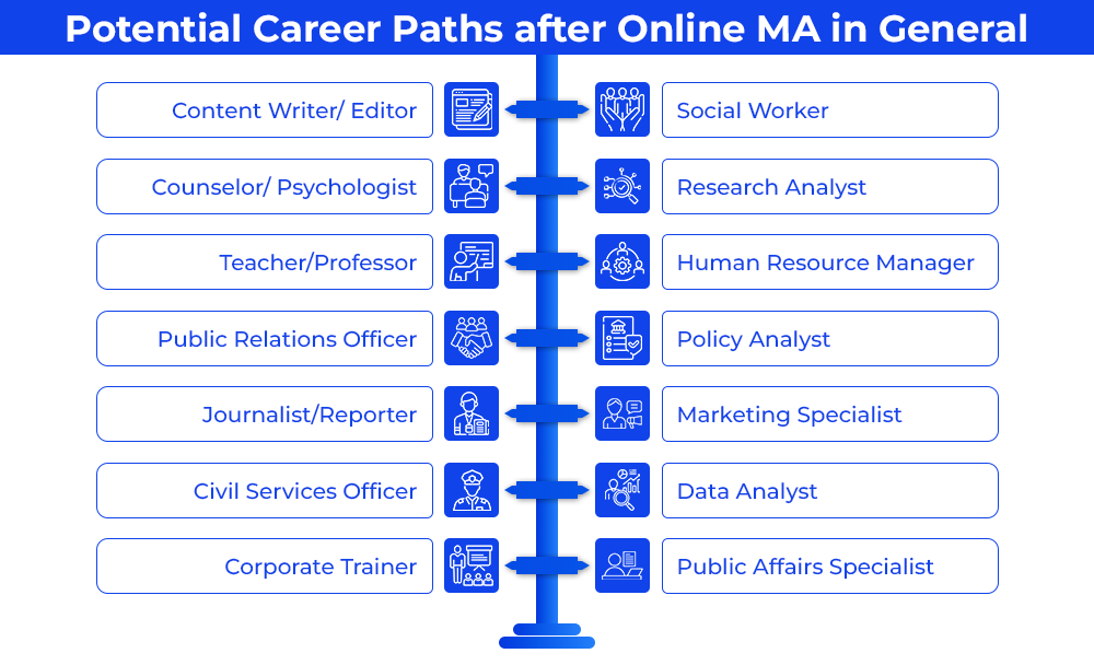 The job roles offered after an online MA in general program are; Financial Analyst, Website content writer, Teacher, HR, Journalist, Market Research Analysts, Communication, Manager, Editor, Management Consultant, Project Manager, Social Worker, Civil service, Psychotherapist, Curriculum Developer, Data analyst, Entrepreneur, Optimizing content for search engines (seo), Researcher, or more.