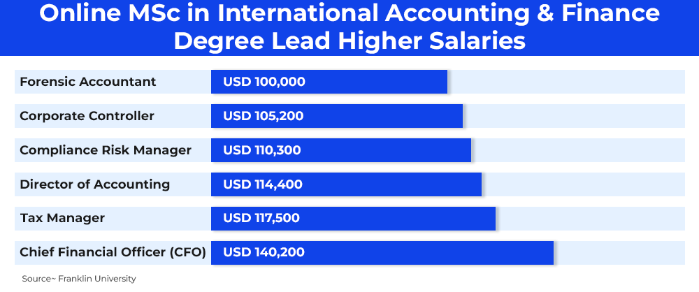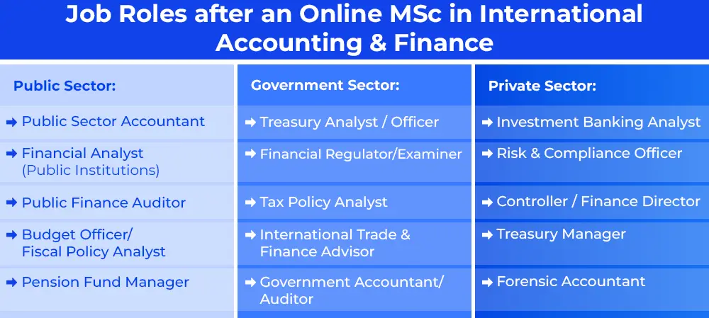Online MSc in International Accounting and Finance program graduates can work as a financial analyst, auditor, finance manager, investment consultant, or pursue CFO and controller positions.